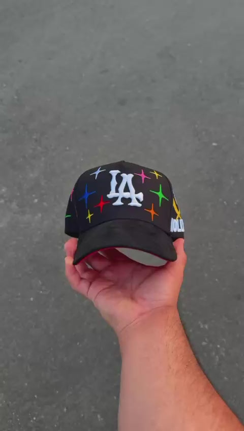 The Hollywood Stars snapback blends West Coast culture with premium materials. Features multicolor embroidered stars, bold logo hits, and a deep red satin lining. Designed in Los Angeles with attention to detail throughout.