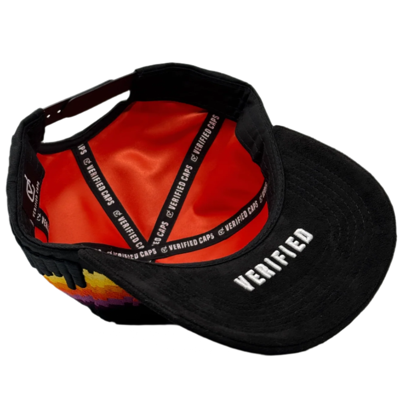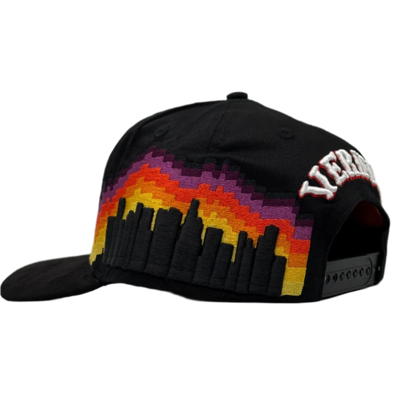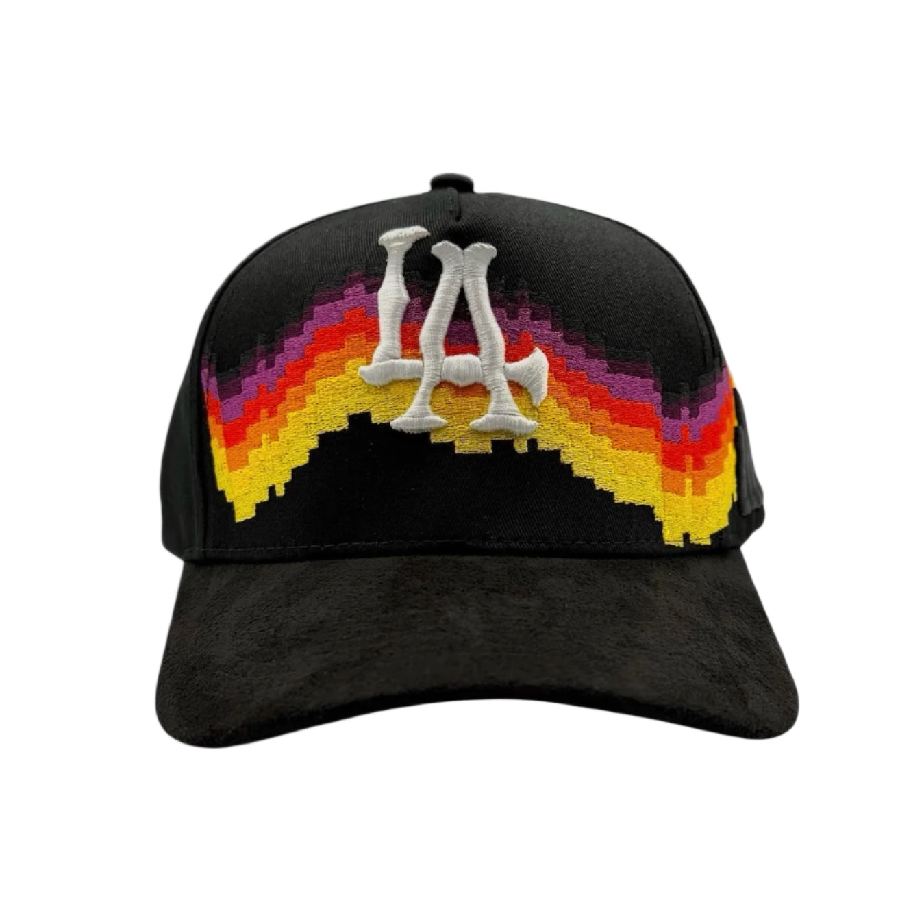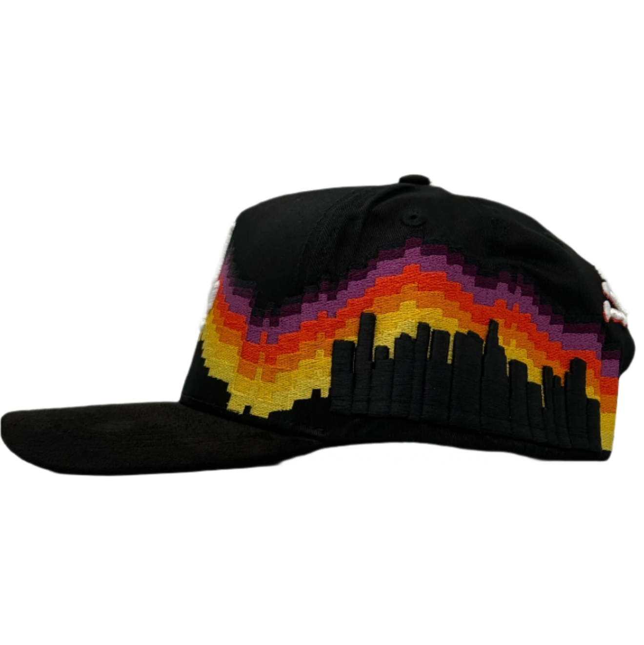 The LA Sunset snapback captures the feel of the city at golden hour. Designed with a structured cotton crown and a premium suede brim, it features raised LA embroidery and a pixel-style skyline in gradient tones. Finished with a blood orange satin interior for a sharp contrast inside and out.